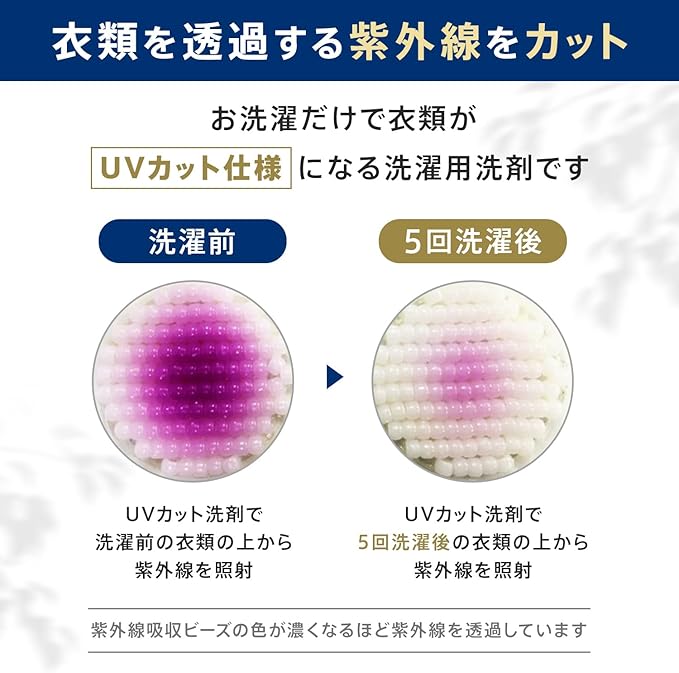 ●手軽に紫外線対策。しかも洗えば洗うほどUVカット効果は高まります。一回洗うだけで紫外線カット率92%。5回のお洗濯で紫外線カット率97%。もちろん洗剤としての汚れを落とす機能も抜群。洗濯物の汚れをすっきり落とした後は、紫外線吸収剤が紫外線をカットします。