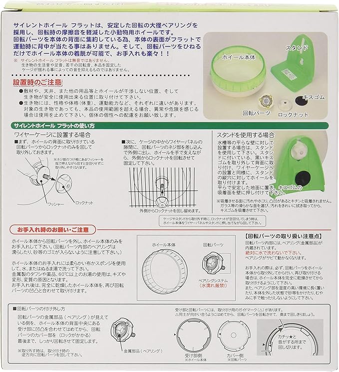 ●本品はハムスター等の小動物用運動器具(回し車)です。 ●他の目的及び他の生き物には使用しないで下さい。 ●本品の取り扱いは丁寧に行って下さい。投げたり、転がしたりしないで下さい。 ●火気には絶対近づけないで下さい。 ●直射日光の当たる所、高温・高湿度になる場所には置かないで下さい。 ●幼児が本品で遊んだりしない様、注意して下さい。 ●部品の分解や改造をしないで下さい。 ●必ず、キスゴムが吸着できる壁面やケージワイヤーに取り付けて使用して下さい。置いただけの状態では、ホイールが転倒する場合があります。 ●使用している間に、固定部(回転パーツ、ロックナット)等がゆるんでくる場合がありますので、使用状況を見ながら、時々確認を行って下さい。 ●複数の生き物が居る場所(多頭飼い等)では使用しないようにして下さい。 ●回転パーツには、金属部品(ベアリング)を使用していますので、水で洗わないで下さい。金属部品(ベアリング)が濡れると、サビが発生して、回りが悪くなったり雑音が出る場合があります。 ●ベアリングの構造上、ホイールのブレに若干のバラつきがありますが、ご了承下さい。 ●サイレントホイールフラットは無音ではありません。(従来のホイールに比べて回転時に発生する音が静かなホイールです。) ●生き物の生活音や若干の回転音、また、本品をケージに固定する場合にケージ部分が揺れる事によって発する音に関しましては、ご容赦いただきますようお願いいたします。 ※生き物は、種類や性格、体格(体重やサイズ、成長など)により、個体差があります。飼育者の方は生き物の行動や習性をよく理解・観察して本品の使用範囲を超える場合や、異常や危険を感じた場合は、直ちに使用を中止して下さい。 ※飼育用品は、100%安全な環境を提供できるものではありません。生き物は、成長によって大きさが変化したり、各個体によって性格も異なります。また、四季を通して、様々に取り巻く環境も変化します。大切なペットの安全な飼育環境を常に保てるようにしてあげましょう。 ※飼育時における事故等に関しましては、責任を負いかねますので予めご了承下さい。 ※製品の仕様、価格等は予告なく変更する場合があります。