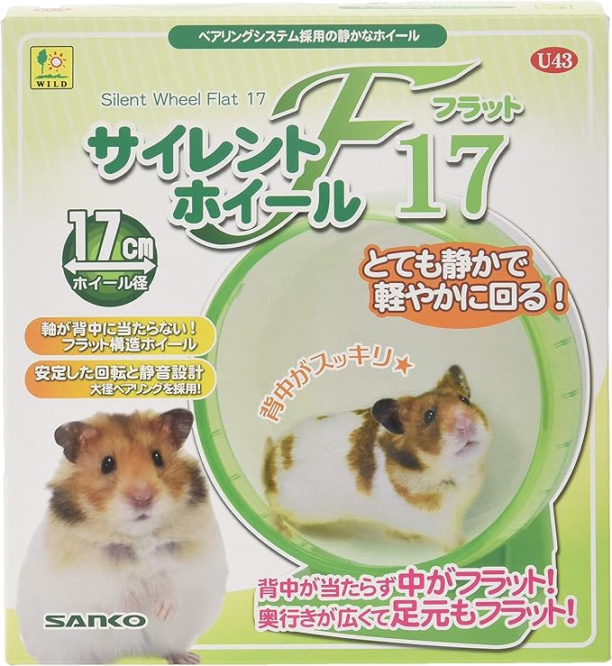 サイレントホイール フラットは、安定した回転の大径ベアリングを採用し、回転時の摩擦音を軽減した小動物用ホイールです。 回転パーツを本体の背面に集約している為、本体の表面がフラットで運動時に背中が当たる事はありません。 そして、回転パーツをひねるだけでホイール本体の着脱が可能で、お手入れも楽々!ホイール径17cm