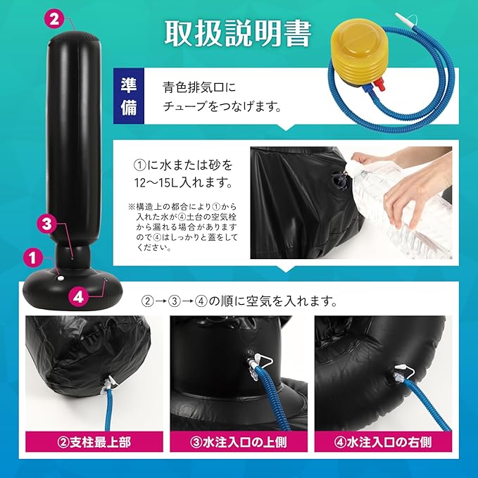 【エアポンプ付き】便利なエアポンプ付属でパッケージ後面にわかりやすいカラー日本語説明書を掲載しているので受け取ってすぐにご使用いただけます。組み立ては簡単!説明書の手順に沿って15分程度で完成します。