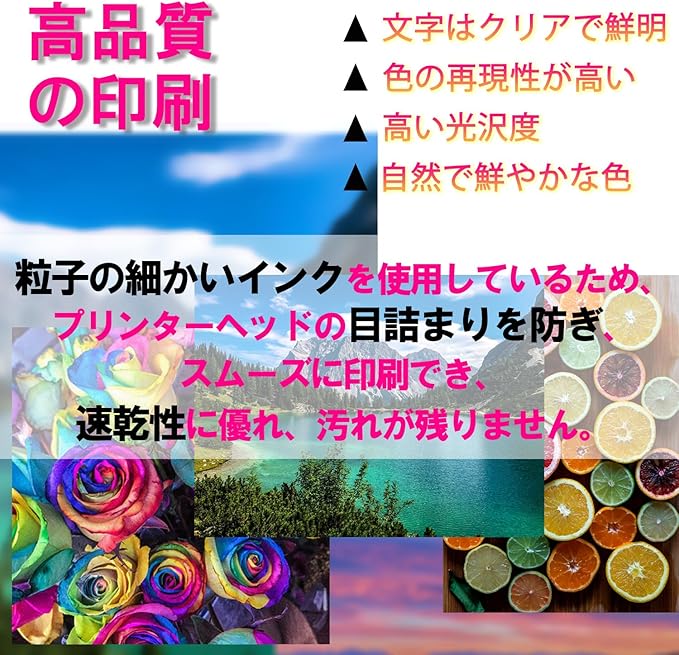 ★【印刷効果】:様々な色調をリアルに再現し、文字や図形の細部まで鋭く表現することが可能です。純正インクに劣らない高品質を実現し、純正との併用が可能です。