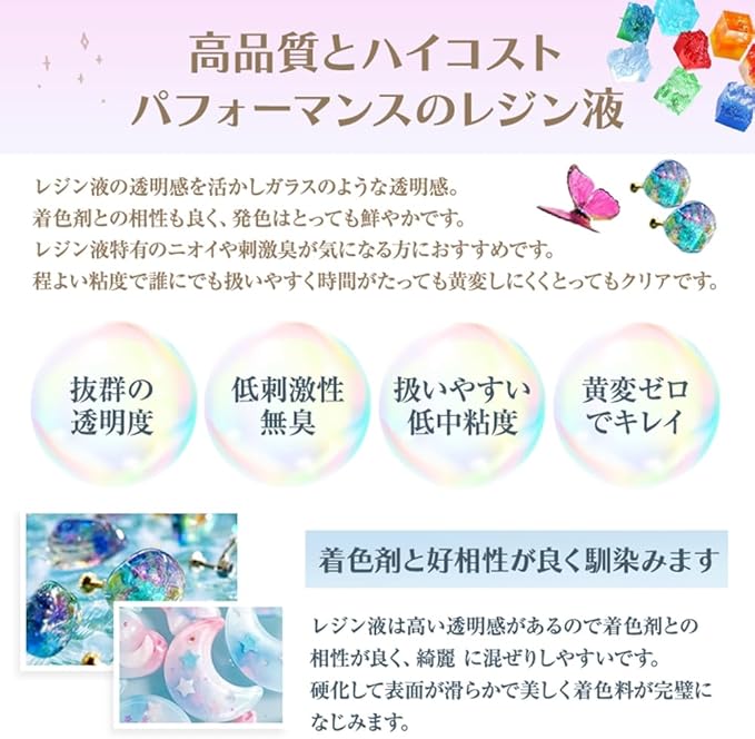 レジン液特有のニオイが気になる方に。刺激臭等ありません。お子様からニオイに敏感な方まで初心者の方でも誰にでも使いやすい。