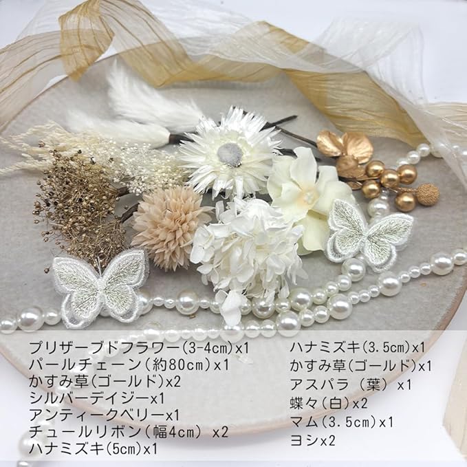 【セット内容】アジサイ、パールチェーン、マム、蝶々、かすみ草、シルバーデイジー、カスピア、ラグラス、チュールリボン、ベリーピック、マム、ゴールド花。セット内容は6枚目の画像をご参照ください。