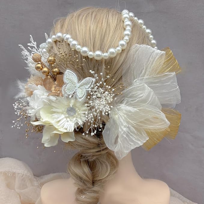 [Usasaki] 髪飾り 成人式 前撮り マム アジサイ 卒業式 入学式 カスミ草 ドライフラワー振袖 袴 ウェディング 結婚式 和装 赤 白 黒 ベリーピック パールチェーン 蝶々 ヘアアレンジ ハーフアップ ロングヘア A24110006 | etshop