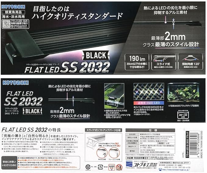 使えば分かる究極の薄さ、明るさ、美しさ。目指したのはハイクオリティスタンダード。放熱性の高いアルミボディを使用した冷却設計により、熱によるLEDの劣化を最小限に抑制。20~32㎝以下水槽用 全光束190lm 定格入力電力AC100V 50/60Hz 定格消費電力 4W ボディカラー:ブラックタイプ