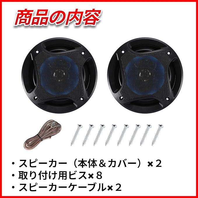 【商品内容・商品サイズ】 サイズ:(約)13.8 6cm、内側直径10.2cm 重さ:(約)428g 公称インピーダンス:4Ω 最大ミュージックパワー:300w 定格電力:30w 商品内容:スピーカー(本体&カバー) 2、取り付け用ビス 8、スピーカーケーブル 2