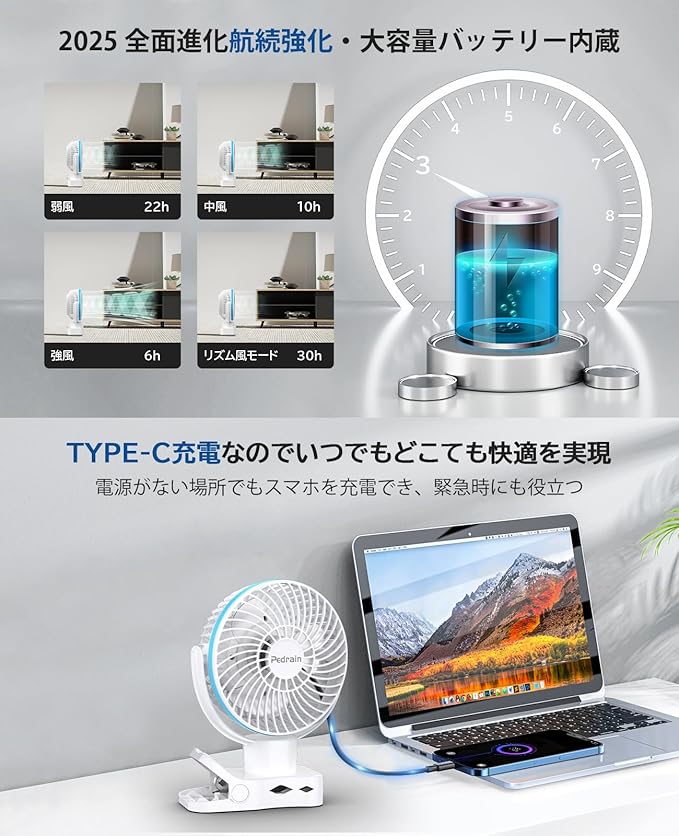 【大容量バッテリー内蔵・TYPE-C急速充電】高性能なバッテリーを搭載しており、3時間フル充電で最大30h連続使用ができ、長時間のコードレスで使用も安心。駆動時間は弱風/約22時間、中風/約10時間、強風/約6時間、リズム風モード/約30時間です。また、外出用としてはもちろん、スマホなどへの充電にもできて緊急時のためにひとつ用意しておくのも良い選択です。この夏、心地よいそよ風を楽しみながら、省エネ・省コストを実現しましょう。