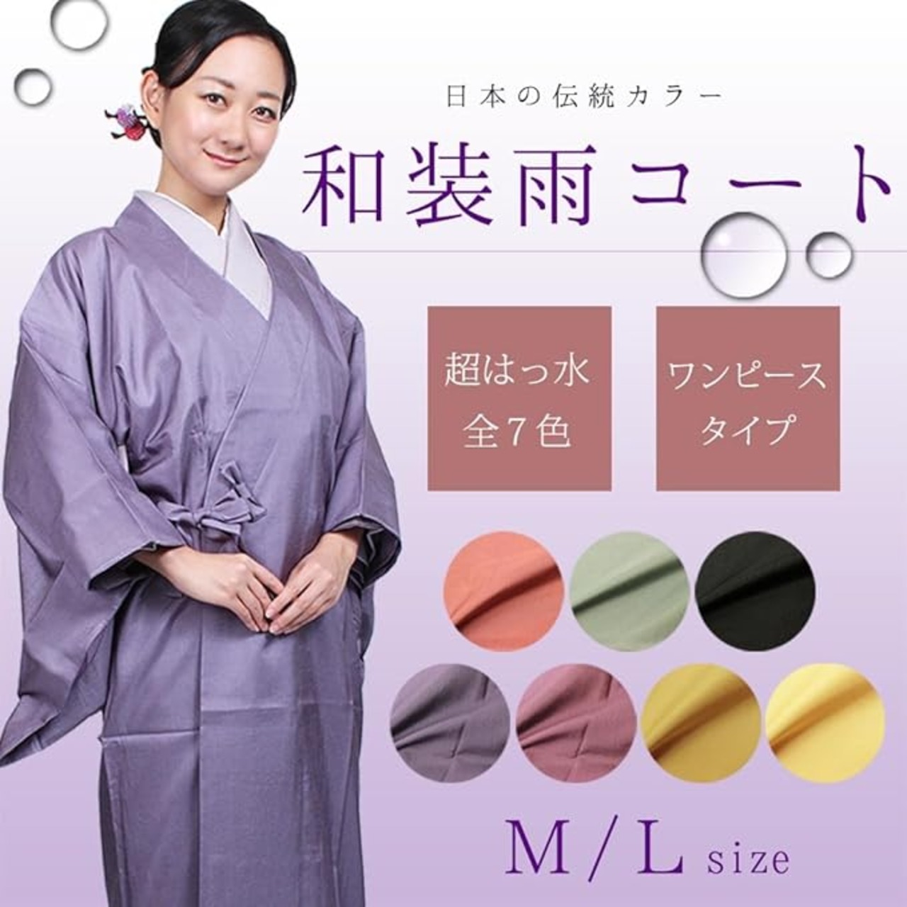 カラーバリエーションの揃ったワンピースタイプの雨コート。超はっ水加工が施され、大切なお着物を雨や雪、汚れから守ってくれます。