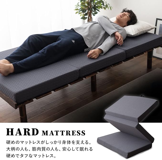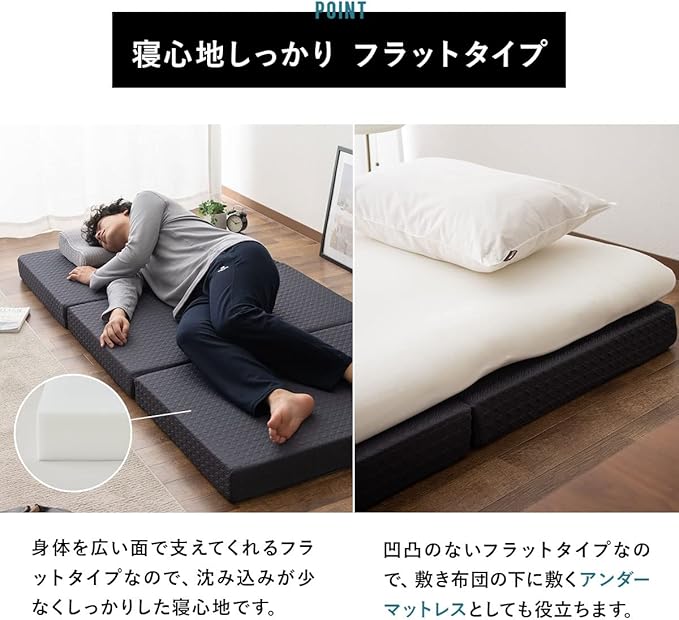 身体を広い面で支えるフラットタイプなので、沈み込みが少なくしっかりした寝心地です。敷布団の下に敷くアンダーマットレスとしてもお使いいただけます。