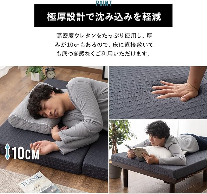 高密度ウレタンをたっぷり使用した厚み約10㎝。床に直接敷いても底付き感なく、快適にご使用いただけます。