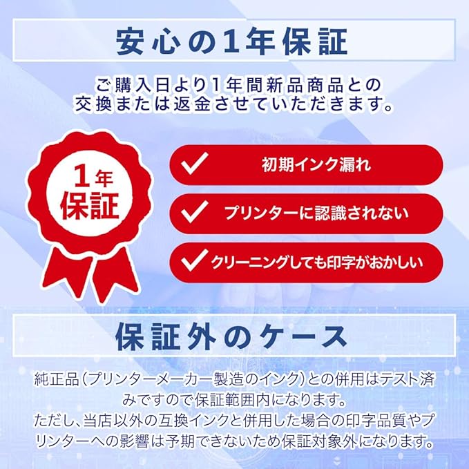 【ご使用上の注意】 (1)インクボトルの注ぎ口の形状が全色同様でどの色のインクタンクへの差し込むことができるため、注ぎ間違いのないようにご注意願います。 (2)純正品及びバウストア製インクボトル以外との併用は想定しておりません。他社製互換インクとの併用時に印字品質の劣化・プリントヘッド目詰まり・その他プリンターへの悪影響が発生する可能性がございます。