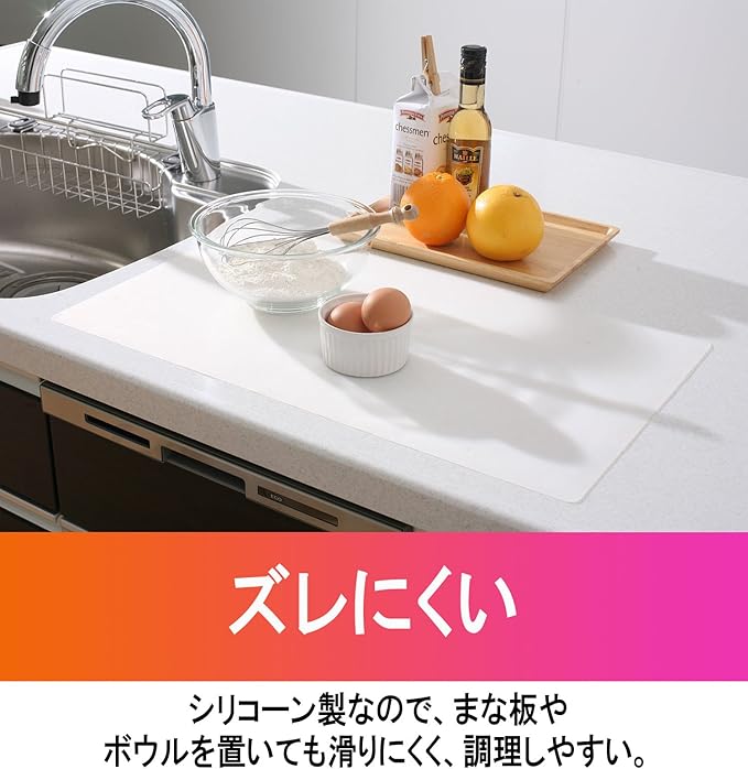 ●調理台をキズ・汚れからガード!。●キズ防止・・・人工大理石やタイル等のキッチンカウンターの汚れやシミ、キズを防ぎます。。●ズレにくい・・・シリコーン製なので、まな板やボウルを置いてもすべりにくく、調理しやすい。4