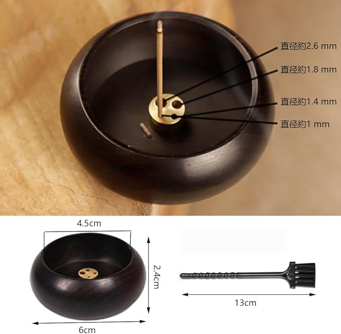 【超小さくて可愛い線香立てです】直径が約6cmと小さく、木製なので置く場所を選ばず使うことができています。子供の手のひらくらいの大きさでかわいらしい。4つの大きさの違う穴あり:様々なサイズの線香でも使えます。気軽にお香が楽しめる作りの良い小さなお香立てです、おすすめします。