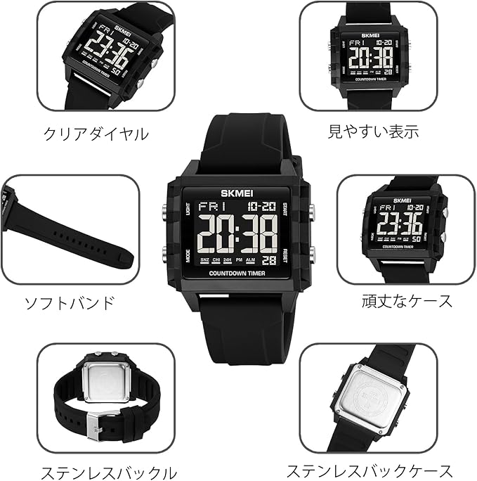 Datirzyx(ダティアシー)大文字 デジタル腕時計 メンズ 夜でも見やすい時計 多機能ウォッチ 四角形 スポーツウォッチ 防水うで時計 仕事時計 led watch 日本電池採用 日本語説明書付 (ブラック+ホワイト)