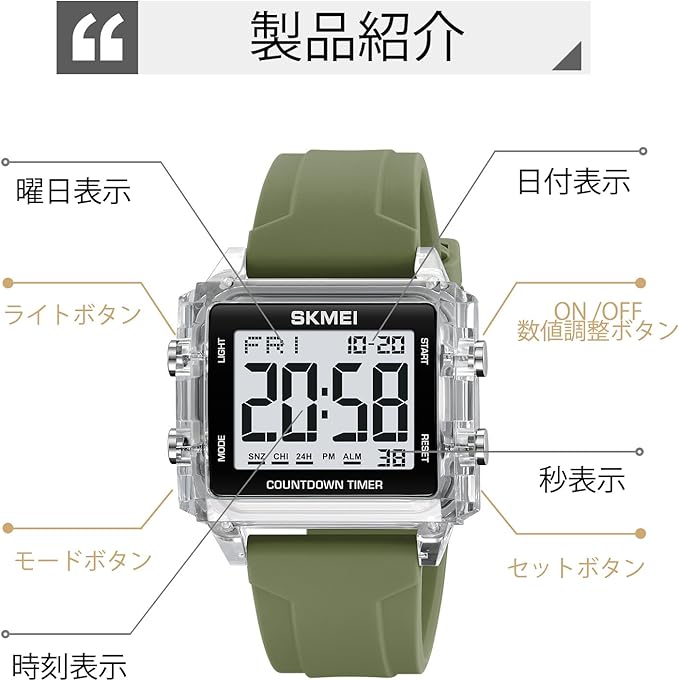 【多機能ウォッチ】アラーム 、ストップウオッチ 、ダブルタイム 、タイマー 、時報 、ELバックライト 、12/24 時間制表示 、防水機能(日常生活防水程度)