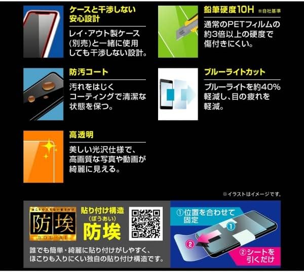 目の疲れを軽減。レイ・アウト製ケース(別売)と一緒に使用しても干渉しない設計。通常のPETフィルムの約3倍以上の硬度で傷付きにくい。汚れをはじくコーティングで清潔な状態を保つ。ブルーライトを約40%軽減し、目の疲れを軽減。