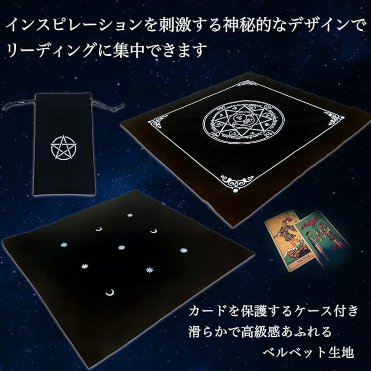 【商品仕様】商品内容:タロットクロス1枚、タロットバッグ1個。カラー:ブラック。サイズ:タロットクロス50cm 50cm。タロットバッグ長さ18cm、幅11.5cm。合計重量:60g。モニターなど環境により画像と若干見え方が違う場合がございます。