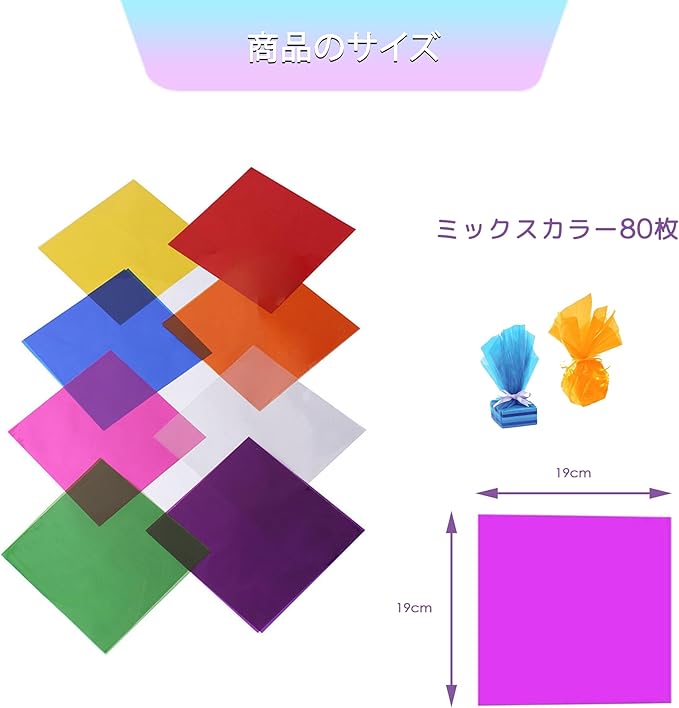【製品仕様】セロハンのサイズ:19x19cm、ミックスカラー80枚 重量:73g