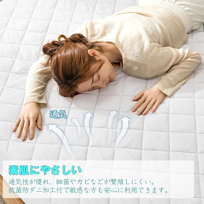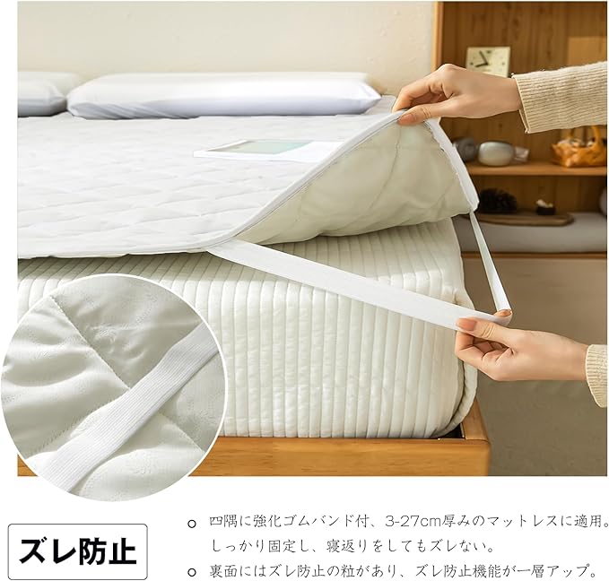 「ズレにくい四隅ゴムバンド+洗濯機で丸洗いOK。お手入れ簡単で、忙しい毎日でも清潔をキープ。」四隅にはしっかりとした幅広のゴムバンドを採用しており、3-27厚みのマットレスに適用です。マットレスや敷き布団にしっかり固定できます。ご家庭の洗濯機でそのまま丸洗い可能。脱水後は速乾性があるため、天気の良い日なら数時間で乾きます。頻繁に洗いたい方や、季節の変わり目にまとめてお手入れしたい方にも最適です。万一商品が問題があったら、気軽にご連絡ください。お客様の都合でへんぴん、交換などの対応が可能です。