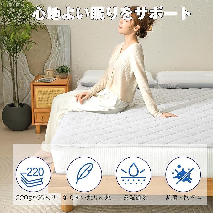 「220gの厚手中綿使用で、ふっくらとした寝心地を実現。ワンランク上の快適さを求める方に。」一般的な敷きパッドの中綿は150g程度が多い。本製品は220gの中綿を贅沢に使用しています。薄すぎず、厚すぎない絶妙なボリュームで、マットレスの硬さをやわらげ、長時間の睡眠でも体への負担を軽減。特に腰や肩への圧を気にする方、床に直接敷いて使う方にもおすすめです。