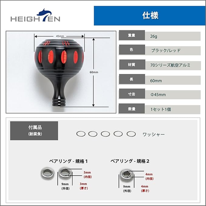 【サイズ】直径45mm、長60mm【重量】ノブ26g、付属品17g【素材】70シリーズ航空アルミ。