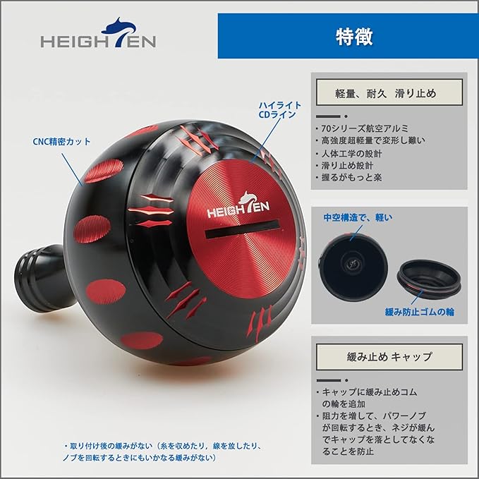 【商品特性】:綺麗な外観、高性能素材、CNC精密加工技術,丈夫で軽い、耐海水、耐腐食、錆付かない、耐久性、安定回転、滑り止め設計、キャップ緩み止め設計、コントロール性能上がり、人体工学設計で疲れない。