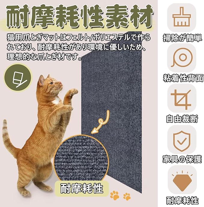 【耐摩耗性素材】猫用爪とぎマットはフェルト/ポリエステルで作られており、耐摩耗性があり環境に優しいため、理想的な爪とぎ材です。猫に楽しく快適な爪とぎ体験を提供すると同時に、家の家具や床、壁の保護にも役立ちます。