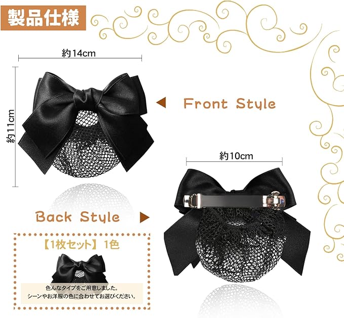 【ネットを取り外すことが可能】 2Wayでお得な蝶結びまとめ髪ネットです。オンの場合、ネット付きで、大人の信頼感を与えます。使い方は超簡単です!?髪をひとつ結びにし、ゴムで結ぶ。ゴムの上にバレッタを留めます。?髪を手でお団子状にし、ネットの中に入れます。?ネットオフの場合、ネットを取り外して、可愛いボウヘアアクセサリーに変身です!