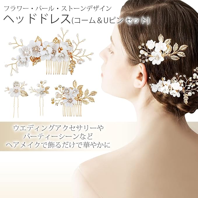 ゴールドをベースにフラワー・パール・ストーンデザインのヘッドドレス(コーム&Uピン 4種セット)です。
