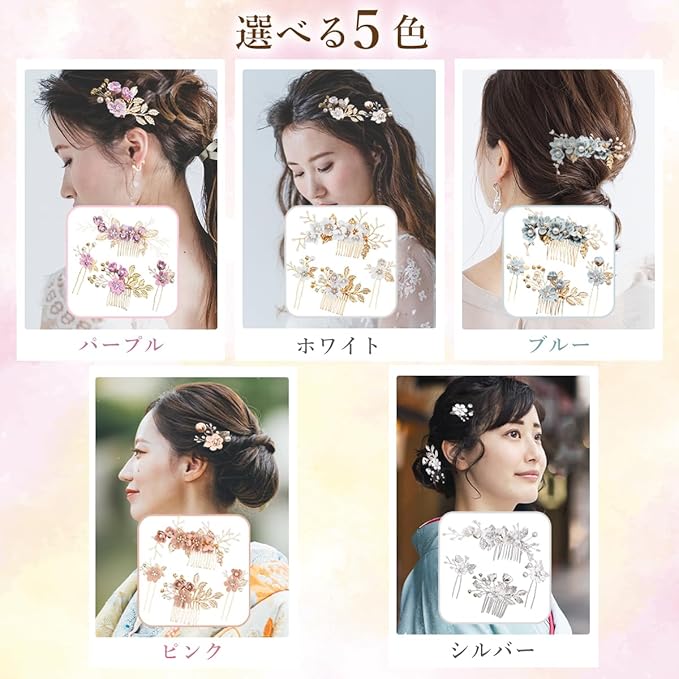 洋装/和装どちらでも使える。小花のやわらかい色味とリーフの絶妙な輝きは和装、洋装問わず様々なスタイルとマッチします。人生の節目や記念日を華やかに演出します。