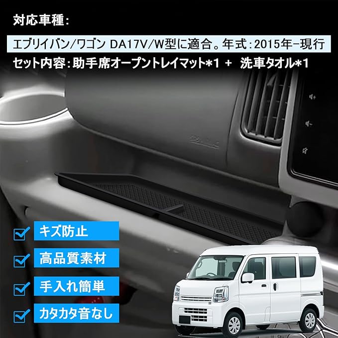 【適合車種】:スズキ エブリイワゴン/バン DA17V/W型に適合。年式:2015年-現行。セット内容:助手席オープントレイマット 1+洗車タオル 1