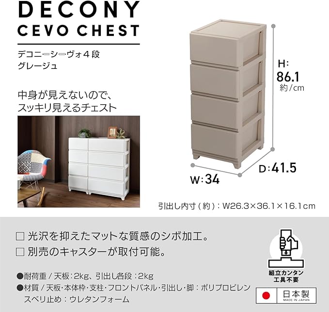 材質:天板・本体枠・支柱・引出し・フロントパネル・脚:ポリプロピレン / スベリ止め:ウレタンフォーム