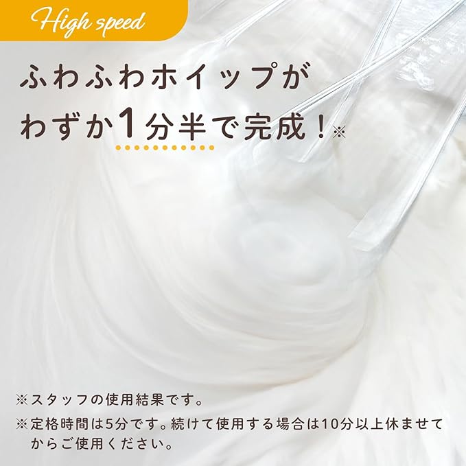 【製品仕様】電源:AC100V 50/60Hz、消費電力:80W、定格時間:5分、速度調節:弱〜中〜強、重量:約530g(ビーター含む)、コード長:1.0m、外径寸法:約幅179 奥行70 高さ120mm、材質:本体:PP、ビーター:ステンレス、保証期間:HOT保証期間1年