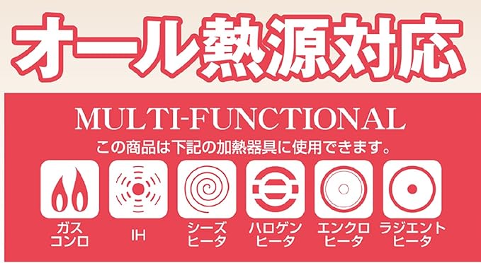 全ての熱源(200V熱源にも対応)どんな加熱器具にも使えます。ガス火にももちろん使用可能。