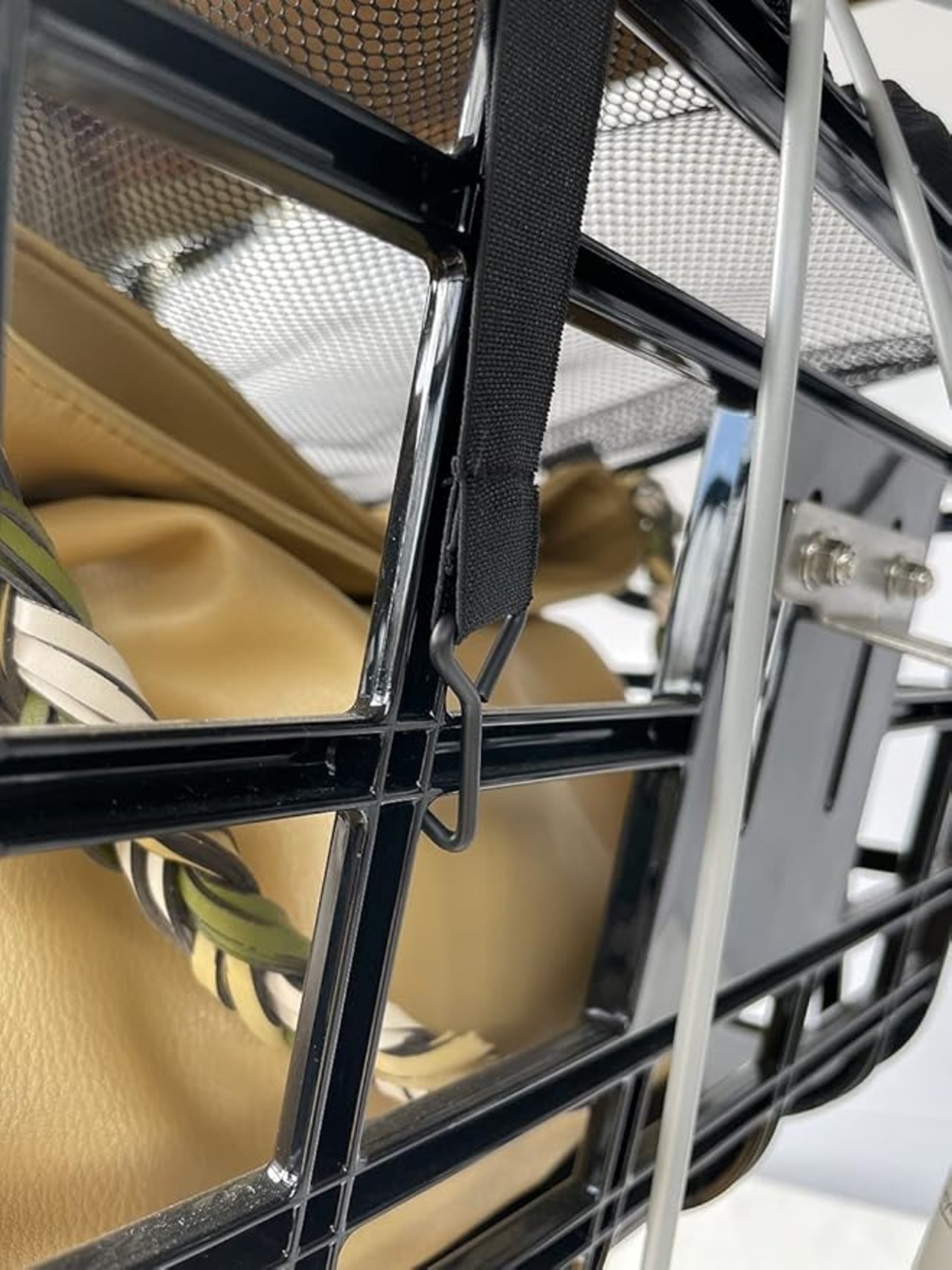 【取付簡単】カゴ全面に固定バンドで取付固定するので一度装着するだけです。荷物の出し入れはレ型止具で出し入れ自由