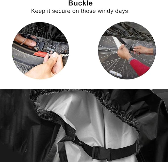 安全で実用的】前輪エリアのロックホール設計により、カバーを付けたまま自転車のロックを使用できます。 ボトムはダブルステッチのゴムの裾と特別なデザインのバックルでぴったりとフィットし、風が強い日でもしっかり固定します。