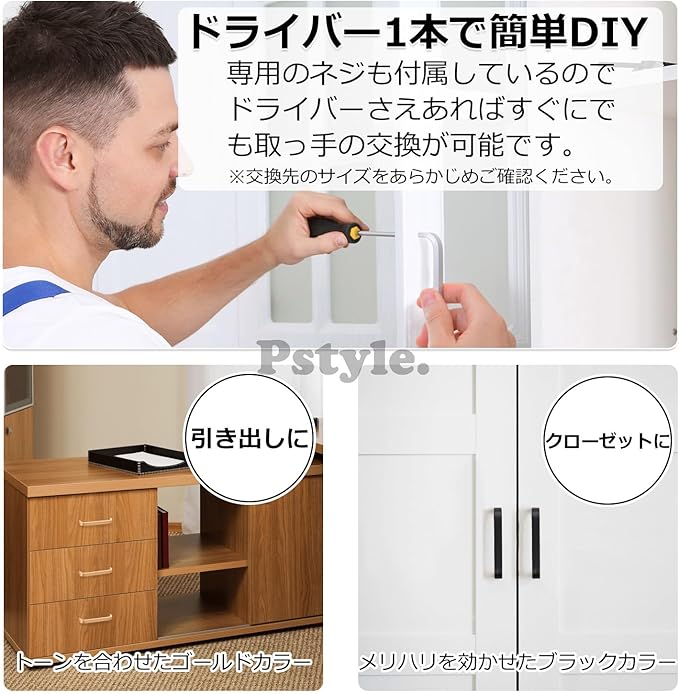 【取手とネジがセットに】 Pstyle.のドア取っ手は、取り付け用のネジ付きで8個セットになっております。クローゼットやキャビネットなどのとってを取り替えてオシャレな家具に衣替えしませんか?