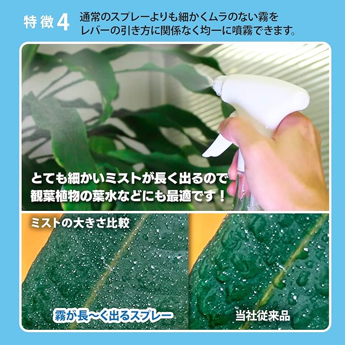 ・植物の葉水に 従来のハンドスプレーよりカマ海粒子が噴霧できるので水とが葉面にしっかりと留まり、ハダニ防止にも役立ちます。 また、推定気が下に滴ることもないので、葉水後に床をふき取る手間も省けます。