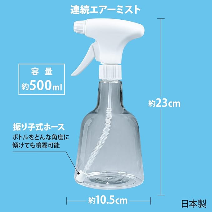 一度の操作でやさしいミストを長い間噴霧 【特徴】 ・従来のスプレーのように、何度もトリガーを引く必要はありません。 ・植物の葉水に 従来のハンドスプレーよりカマ海粒子が噴霧できるので水とが葉面にしっかりと留まり、ハダニ防止にも役立ちます。 また、推定気が下に滴ることもないので、葉水後に床をふき取る手間も省けます。 ・空間の除菌に 消毒用エタノールが使用できるので、インフルエンザ等のウィルス対策に使用いただけます。 霧が長く続くため、トリガー操作も少なく済み、広い空間の除菌に便利です。 ・熱中症対策に 細かい霧を顔や腕、足に吹きかける事により、早く気化熱を発生させて体温を下げるのに役立ちます。 暑い中でのスポーツやお出かけ等、様々なアウトドアイベントの際に、熱中症予防としてご使用いただけます。 ・爬虫類の飼育に 従来の粒の大きいスプレーでは爬虫類はストレスを感じてしまいます。 細かい霧は爬虫類の飼育ケースの環境を最適に整えるための湿度調整や脱皮不全の防止などに最適です。 ・ミストが止まる前トリガーを何度も引くことによって細かいミストを長く持続します。 また、振り子ホースを採用しているので、傾けた状態でも噴霧することが可能。 【注意事項】 使用に際しては必ず商品の説明をよく読んで、記載内容に従ってご使用ください