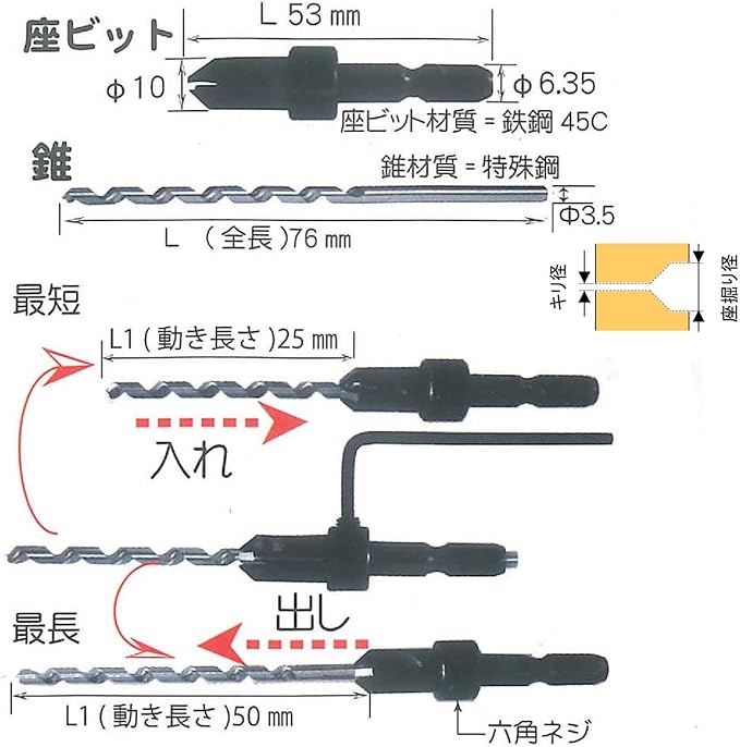 材質 座掘りビット:鉄鋼45c キリ:特殊鋼