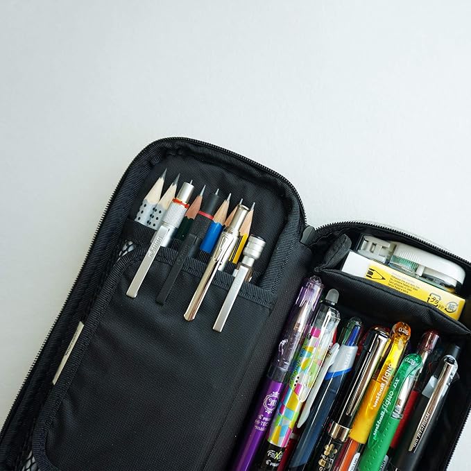 大容量ペンケース、メッシュポケット1箇所・消しゴム用仕切り・5本用ペンホルダー搭載で、筆記具と消しゴムを分けて収納可能、スムーズに取り出せる設計。