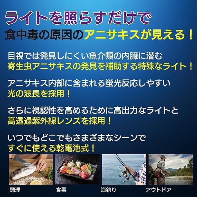 目視では発見しにくい魚介類の内臓に潜む寄生虫アニサキスの発見を補助する特殊なライト!ライト照らして目視で確認することは厚生労働省も推奨!