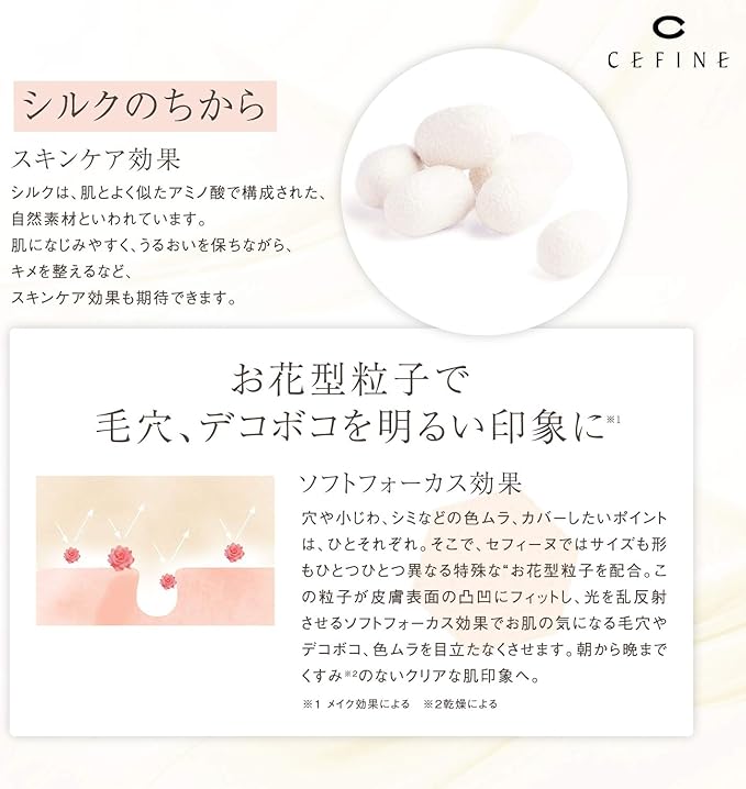 特徴 うるおいを守る, オイルコントロール, カバー力, フィット, 美容液成分配合, 肌のキメを整える, 肌を明るくする, 自然な仕上がり, 色落ちにくい, 色補正