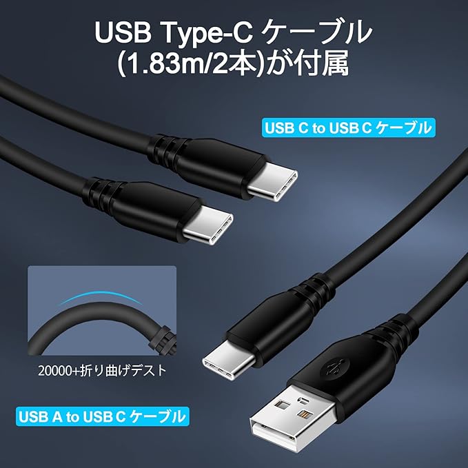 【2本の1.83M USB Type C ケーブルが付き】:USB-C & USB-C ケーブルとUSB-A & USB Type C ケーブルの端子部はアルミ合金を使用しており、10000回以上の挿入に耐え、柔軟性と耐久性に優れています。 内部構造:高純度銅線と丈夫なTPE素材を使用し、絡まりと断線しにくく、丈夫で頑丈です。また、タイプC ケーブルはUSB 2.0規格で最大480Mbpsの高速データ伝送を実現し、充電が早くなります、過充電防止機能付きで、もっと本体のバッテリー保護します。