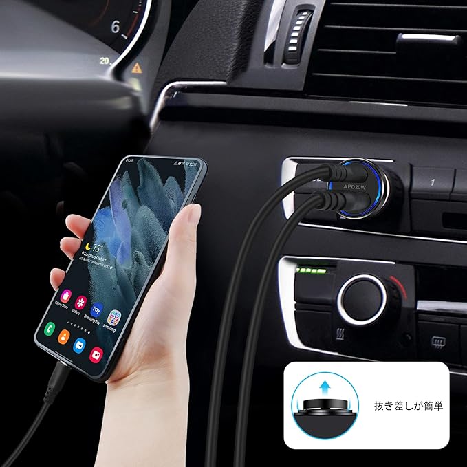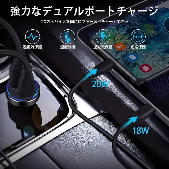 【PD/QC3.0対応&2台同時に急速充電】: USB-C(20W Power Delivery3.0対応)ポートとUSB-A(18W Quick Charge3.0対応)ポートを搭載。2ポート利用時でも合計最大38Wの出力で、2台のスマートフォンを同時にフルスピード充電することができます。従来のUSB車載充電器と比べて、約4倍も充電時間を短縮させることが可能です。