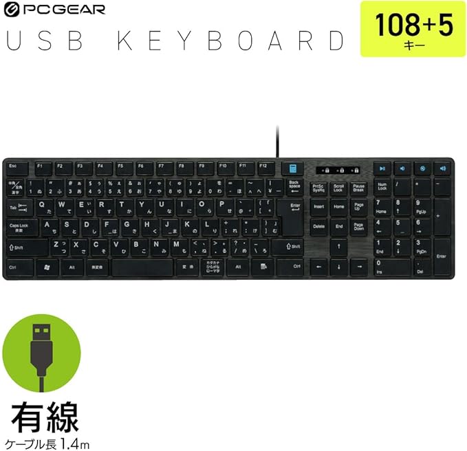 ◆日本語108キー+5ファンクションキー ◆テンキー付きフルキーボードで作業効率アップ ◆専用ドライバなどのインストール不要、USBポートに挿すだけでパソコン接続 ◆19mmキーピッチ、3mmキーストローク ◆本体カラーはブラック