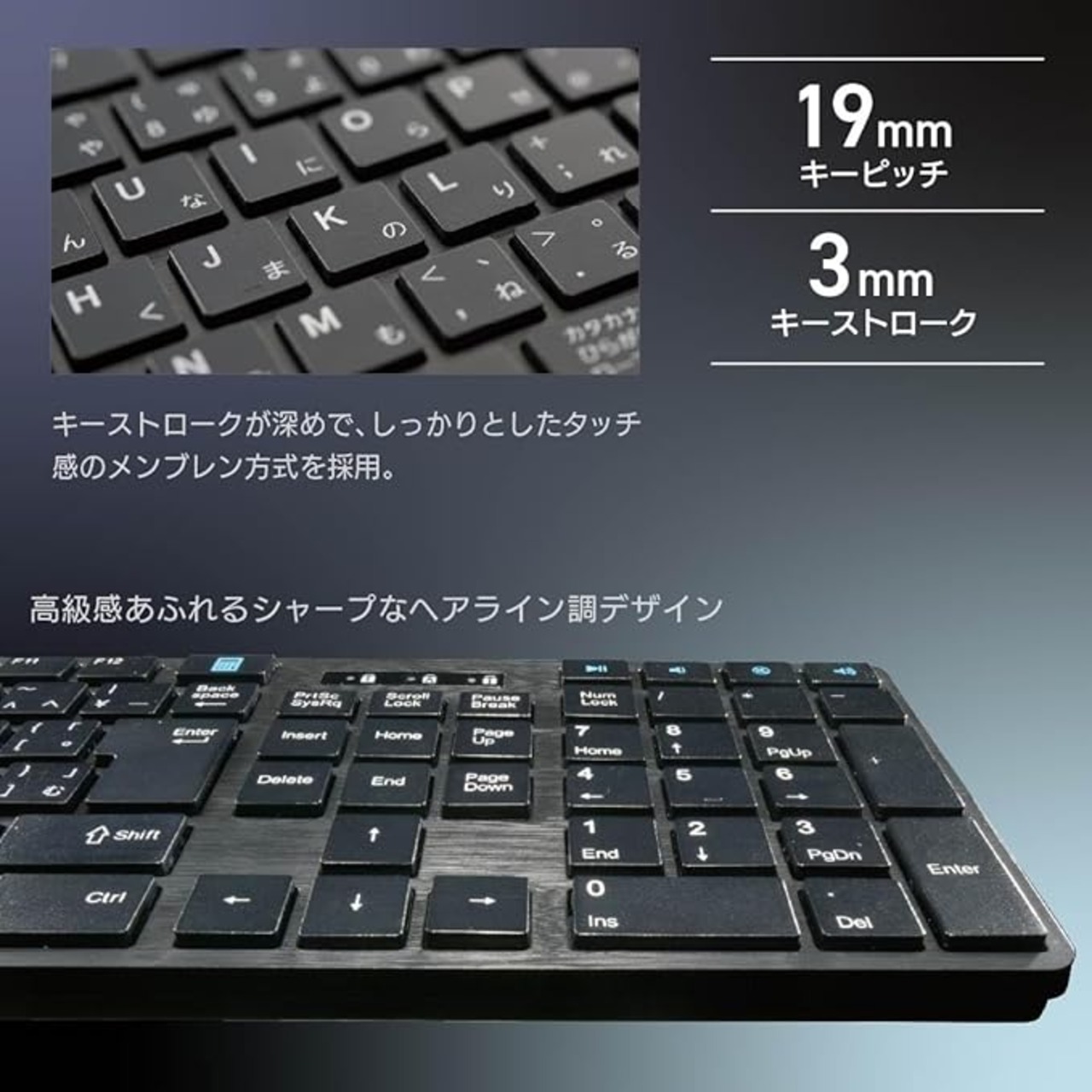 【 特 長 】 ◆高級感あふれるシャープなヘアライン調デザイン ◆キーストロークが深めで、しっかりとしたタッチ感のメンブレン方式を採用
