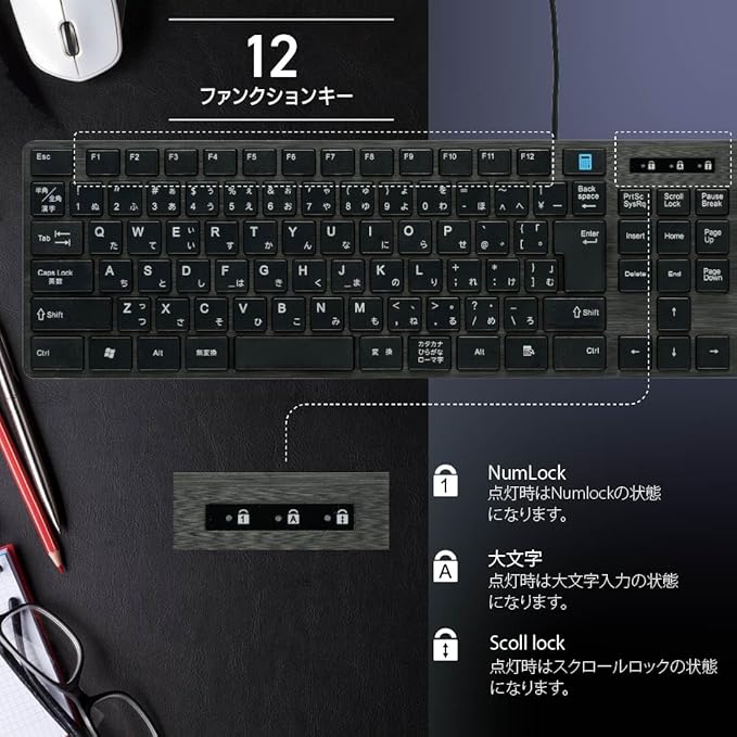 ●高級感あふれるシャープなヘアライン調デザイン ●キーストロークが深めで、しっかりとしたタッチ感のメンブレン方式を採用 ●日本語108キー+5ファンクションキー ●テンキー付きフルキーボードで作業効率アップ ●専用ドライバなどのインストール不要、USBポートに挿すだけでパソコン接続 ●19mmキーピッチ、3mmキーストローク ●本体カラーはブラック