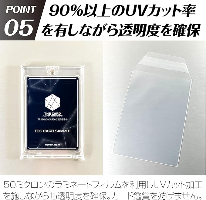Made In Japanに拘るPSA鑑定アクセサリ専門HOTTHECARD。 大ヒットを誇るPSAスリーブは他社と一線を画すOPP/CPPのラミネート素材を採用。 独特の触り心地がコレクターの皆様から大好評を得ております。 本製品はPSAスリーブで培った技術を余すことなく利用し、35PTマグネットホルダー専用として技術を落とし込んだスリーブです。UltraPro(ウルトラプロ)やUltimateGuard(アルティメットガード)のサイズに準拠。ホビーベース製のマグホにも封入は可能ですが、かなりきつく押し込む形で入れることになりますのでご承知おきください。最新の試験結果によるフィルムのUVカット率は非常に高いものとなっており、UV-A,UV-Bともに90%以上のカット率を叩き出しました。(商品画像参照)インクや紙の劣化を引き起こす波長帯のメインである320-360nmまでは従来のフィルムをさらに上回る結果となり、また320nm以下では100%に近い高いカット率となります。 THECARD史上最強のフィルムです。このようなカット率が高いフィルムは今までも存在しておりますが、透明度や色味に問題がありました。今回その点について研究を重ね、コレクターの皆様の需要に耐えうる透過率約90%のレベルまで引き上げ色味も黄ばんだようなことも無く白です。是非お手に取ってみてください。