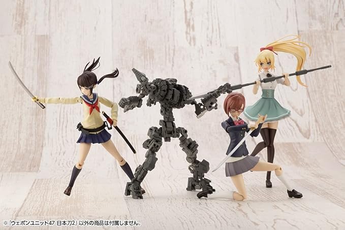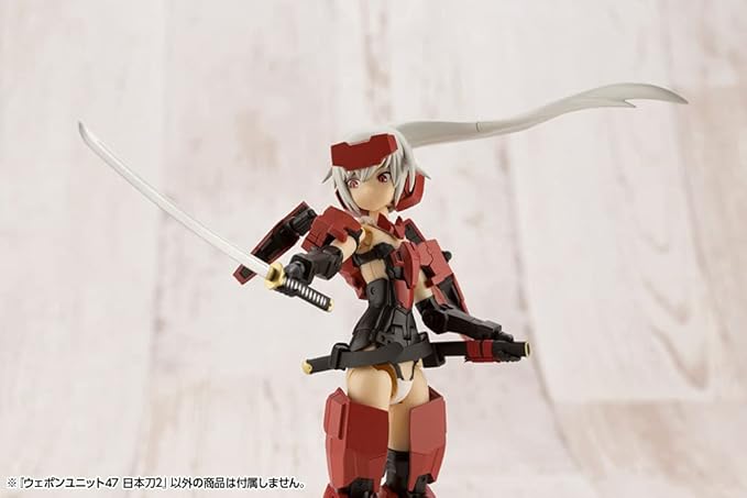 人気のウェポンユニットシリーズから日本刀のVer.2が登場。フレームアームズ・ガールや創彩少女庭園などキャラクタープラモのスケール感に合わせサイズを小さく、さらにディテールアップ!刀身部分を塗装済みにすることで組み立てただけでも見栄えが良くなりました。